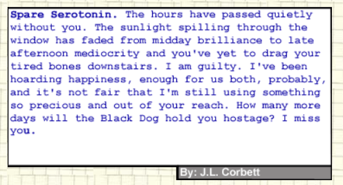 October 24, 2020January 28, 2024 Idle Ink Spare Serotonin Published in Paragraph Planet, January 2019. Read it here. (published under J.L. Corbett, a previous pen name) Share this: Click to share on X (Opens in new window) X Click to share on Facebook (Opens in new window) Facebook Like Loading... Related